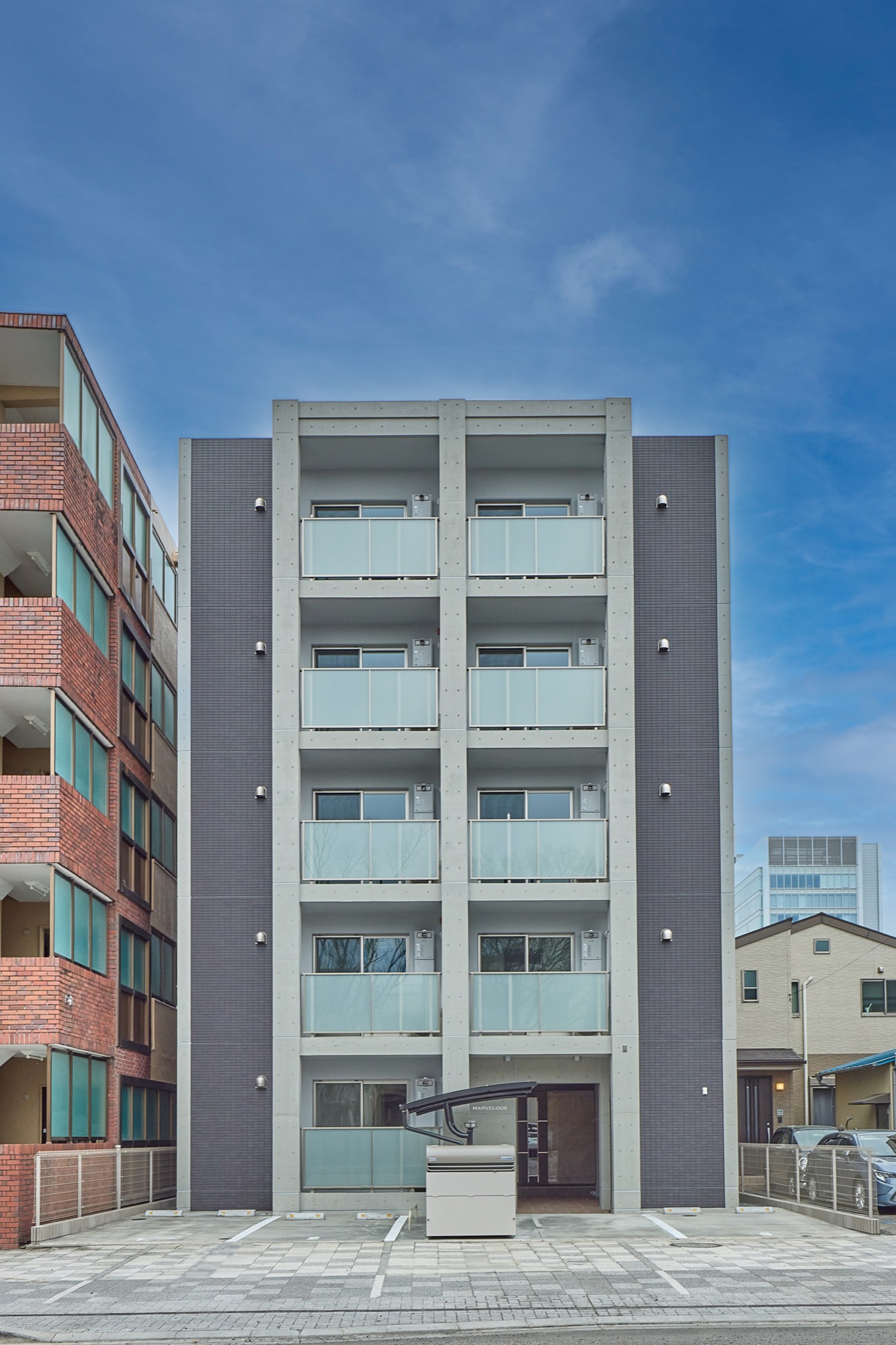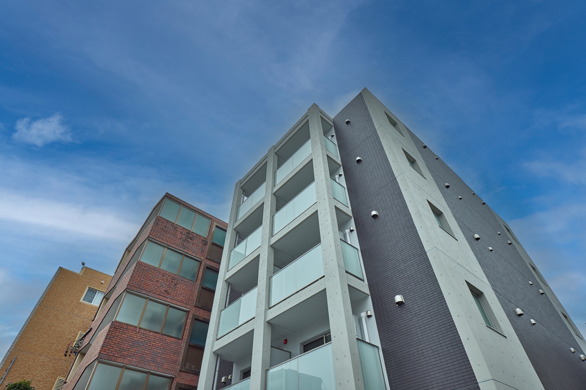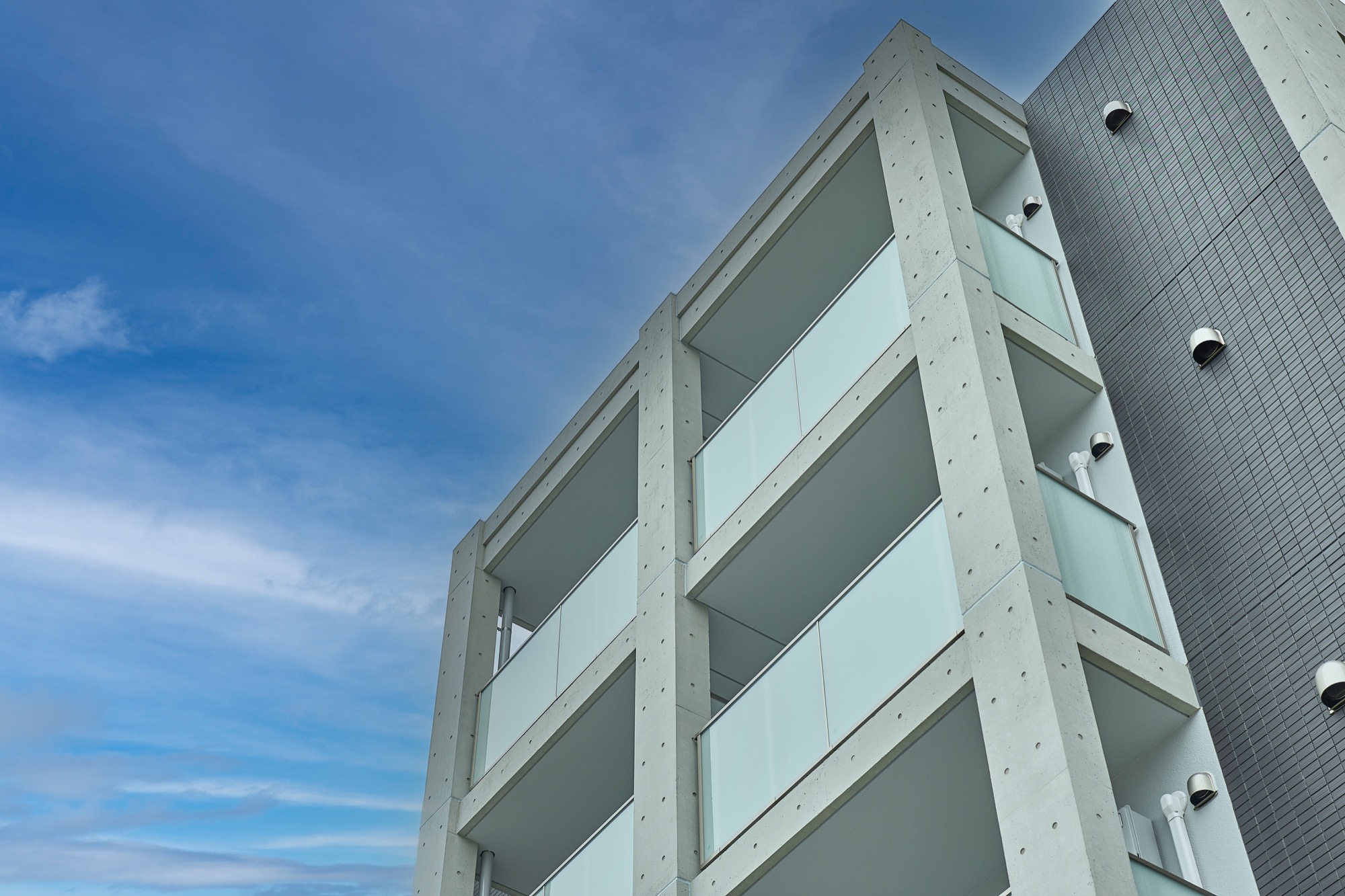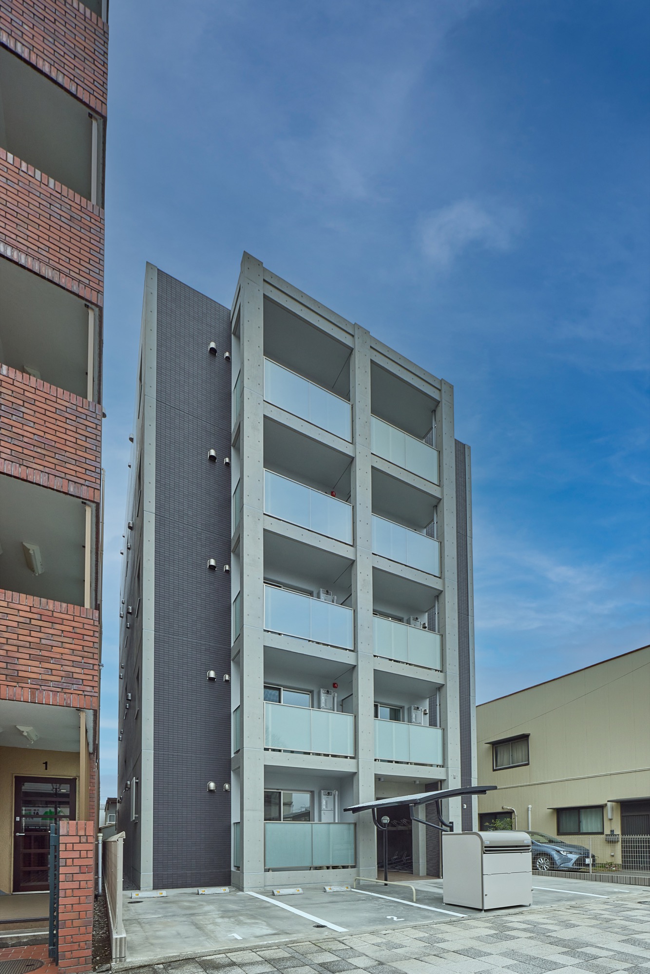 静岡駅にほど近く、大通りに面していることから、都市型の洗練された印象を与えるデザインを目指しました。コンクリート打ち放しの無機質な質感に、ガラス手摺の軽やかさと外壁タイルの温かみを組み合わせることで、素材のコントラストを際立たせた仕上がりとなっています。外観だけでなく、エントランスや共用部にもアーバンな雰囲気を持たせ、入居者にとっても誇れる住まいを意識しました。オーナー様のこだわりと私たちの提案が融合した、魅力ある物件に仕上がりました。