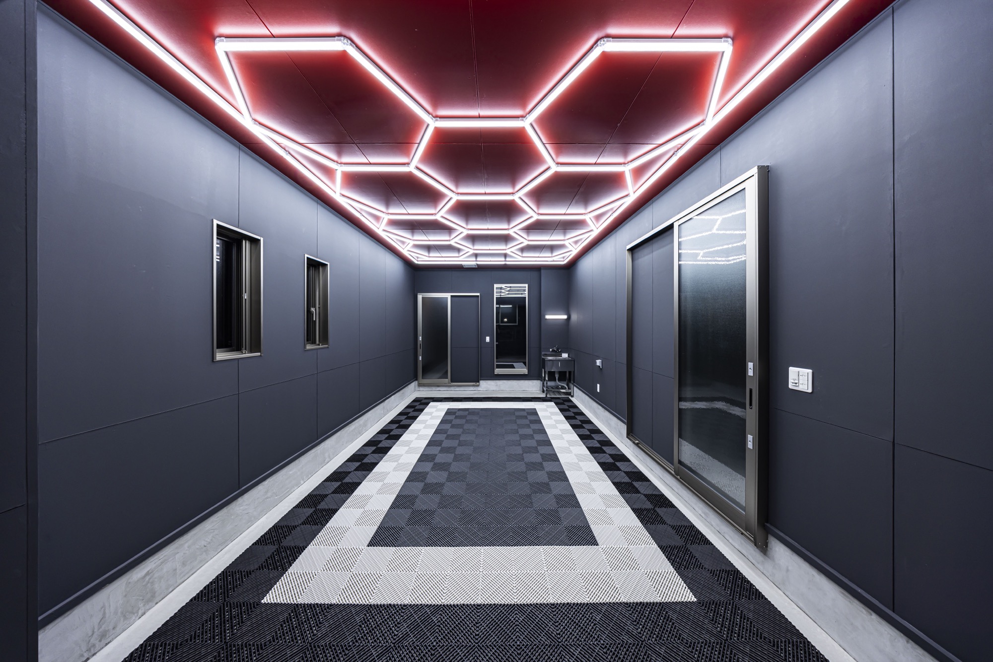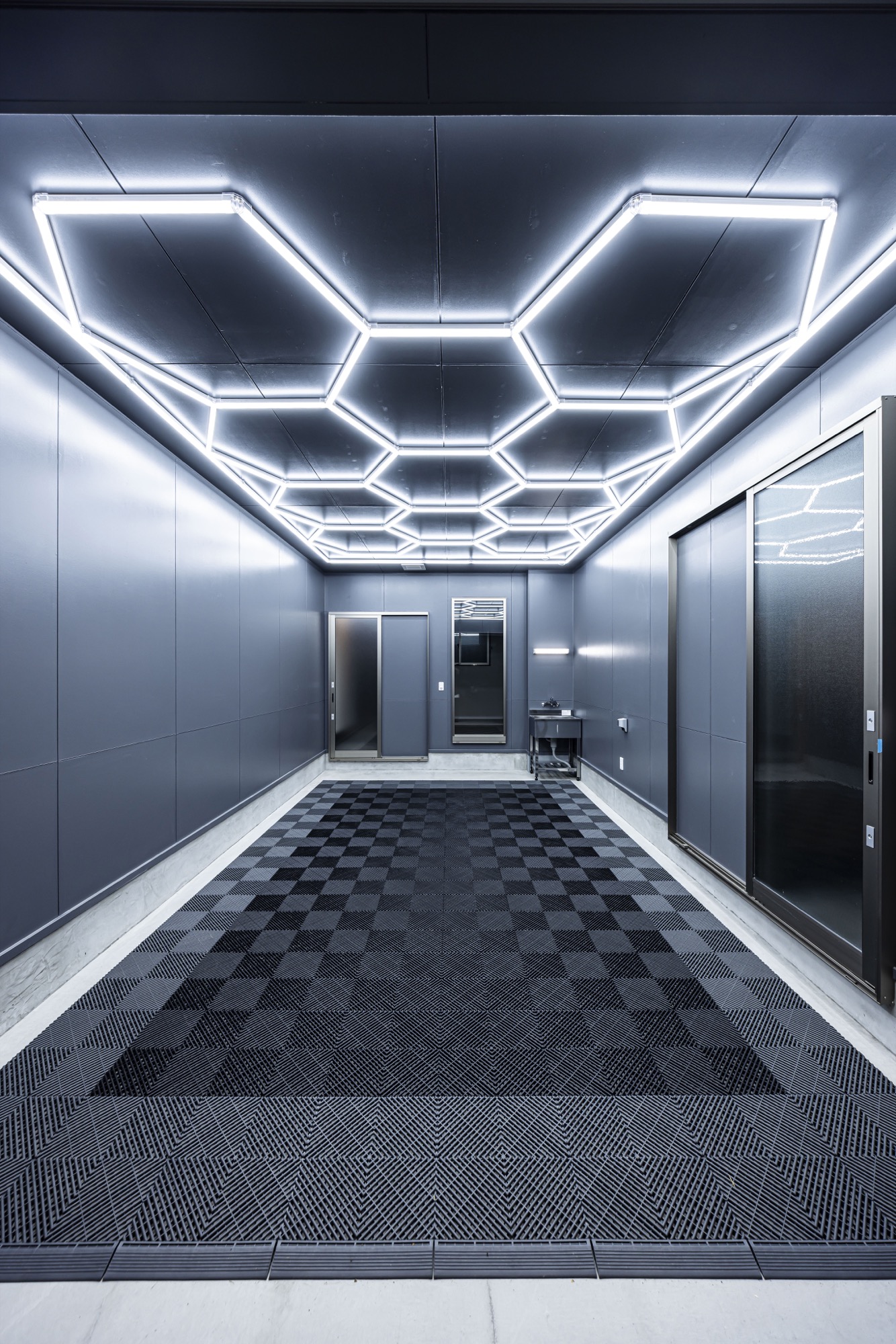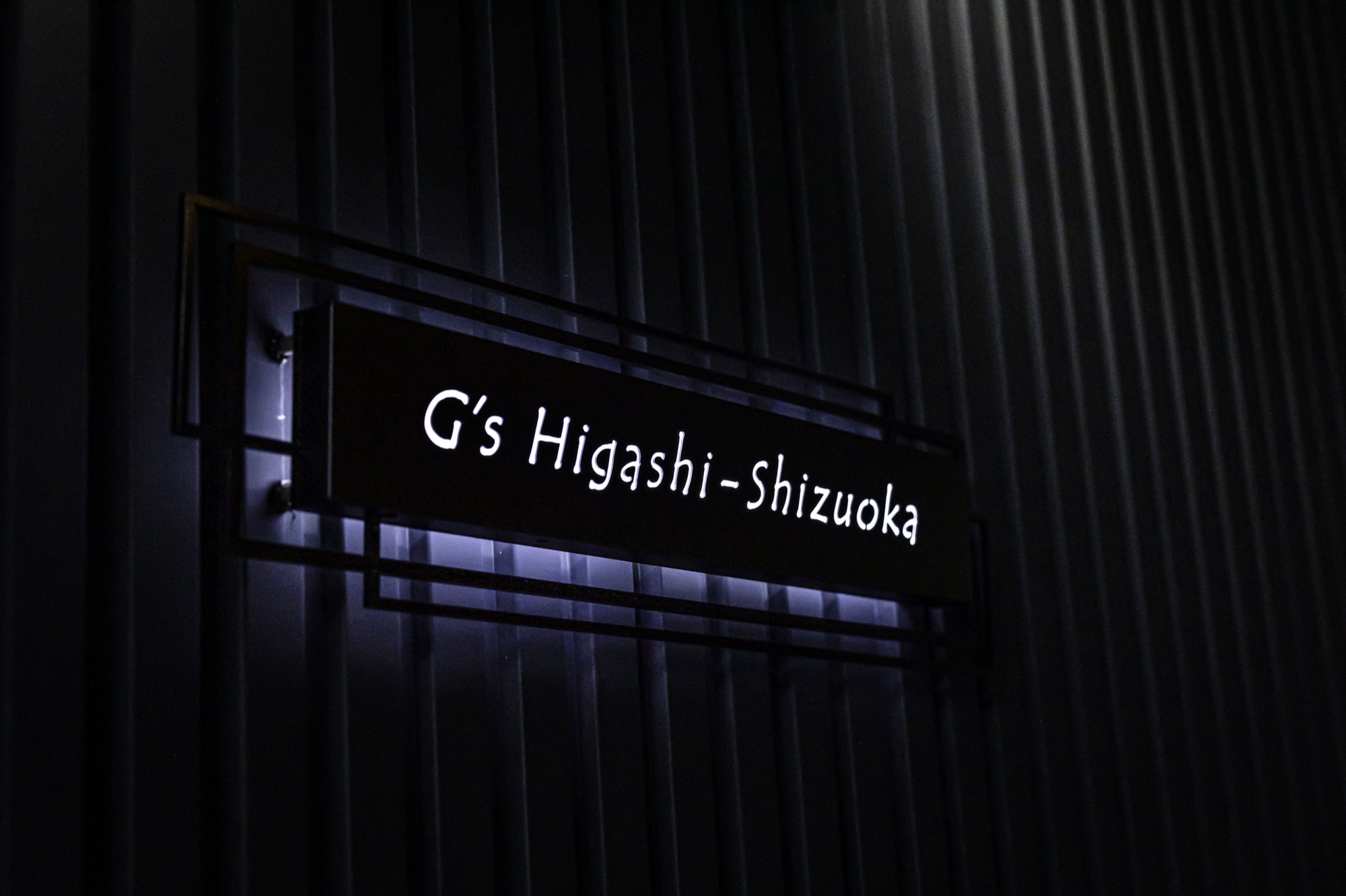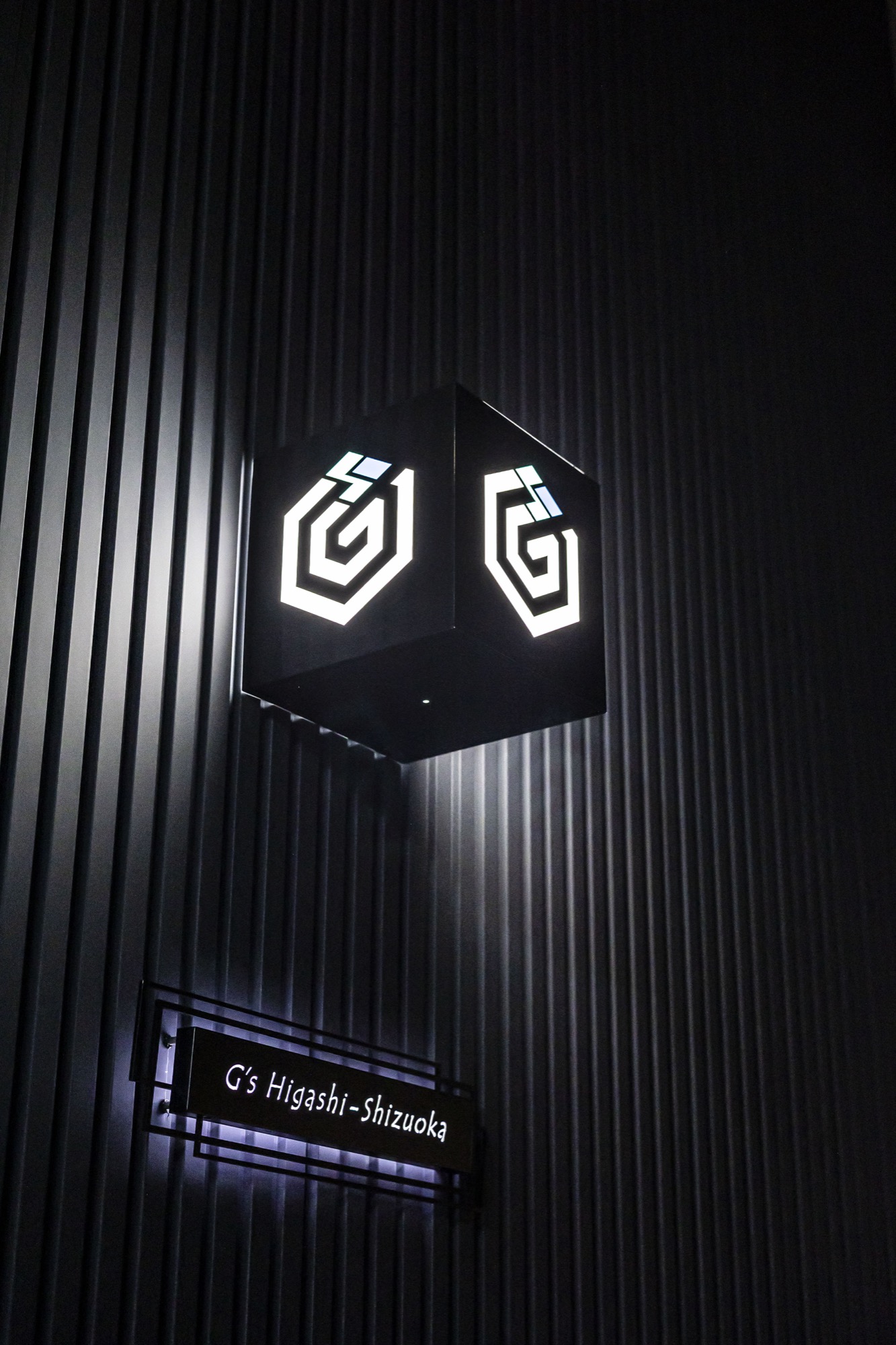 G’s東静岡 館名の「G’s」をモチーフにしたオブジェライトや、明かりで文字が浮かび上がる館銘板も印象的なアクセントに。 外灯のない道路沿いには、滑走路のライトを思わせるアッパーライトを配置し、建物を照らしつつ安全性にも配慮しました。