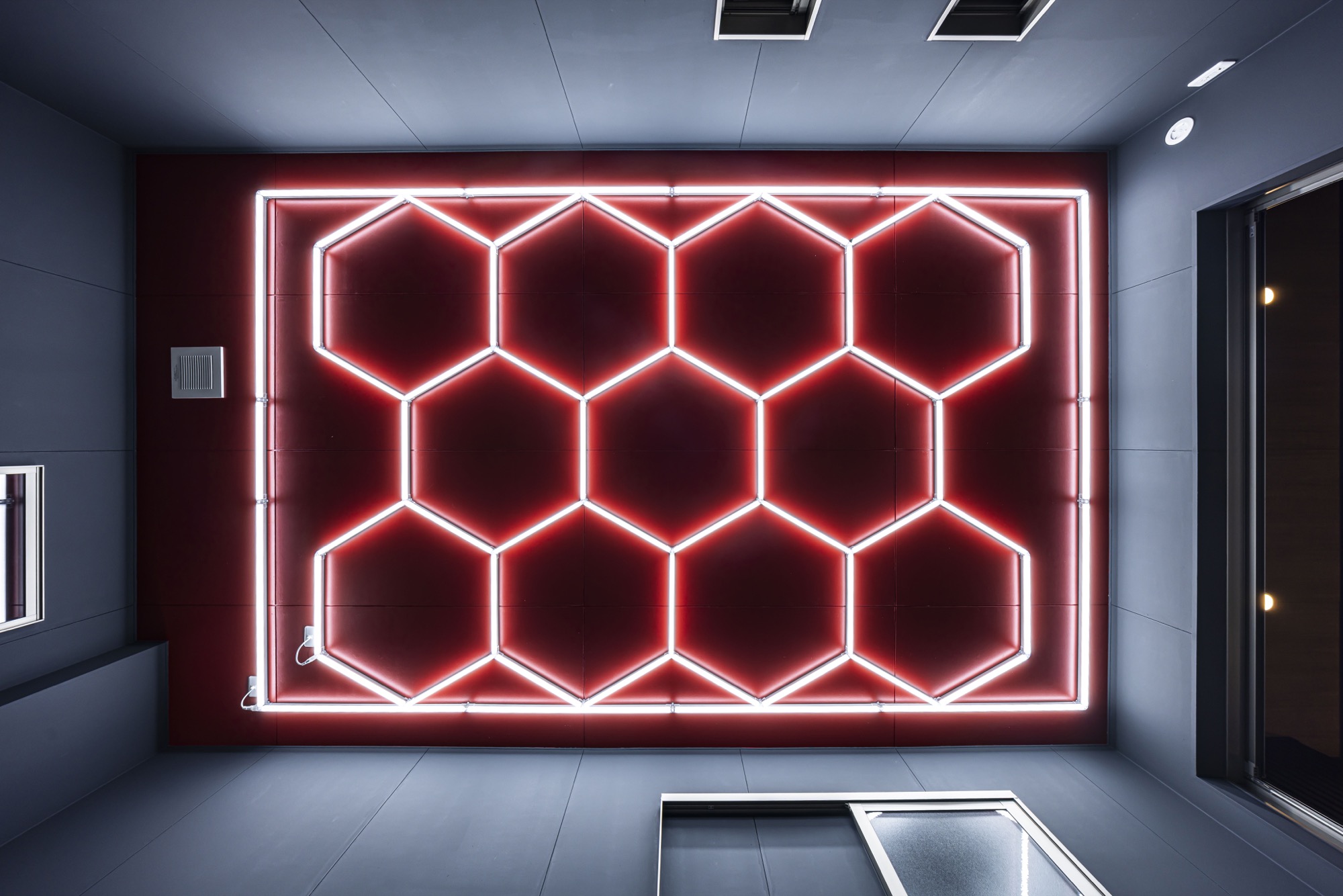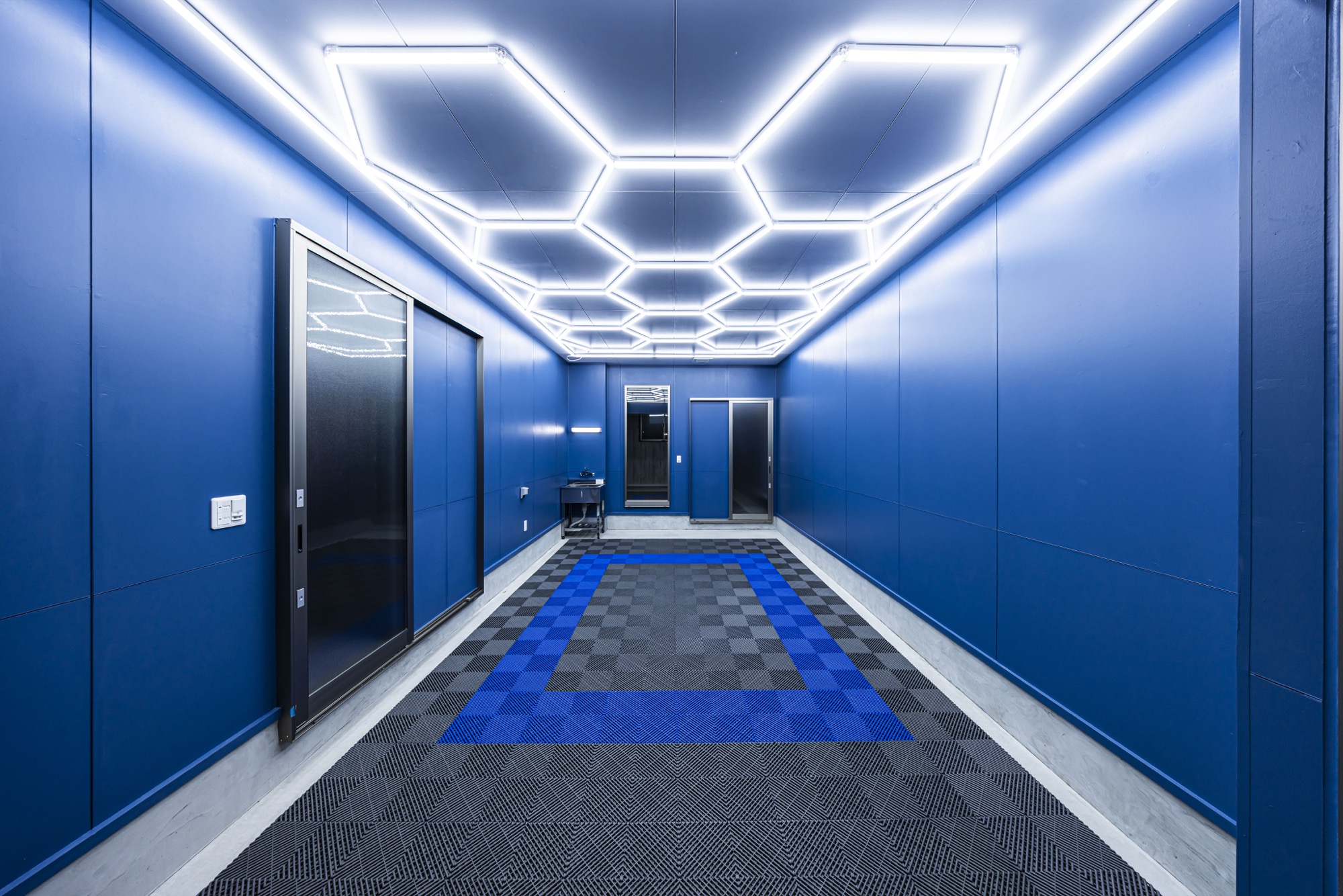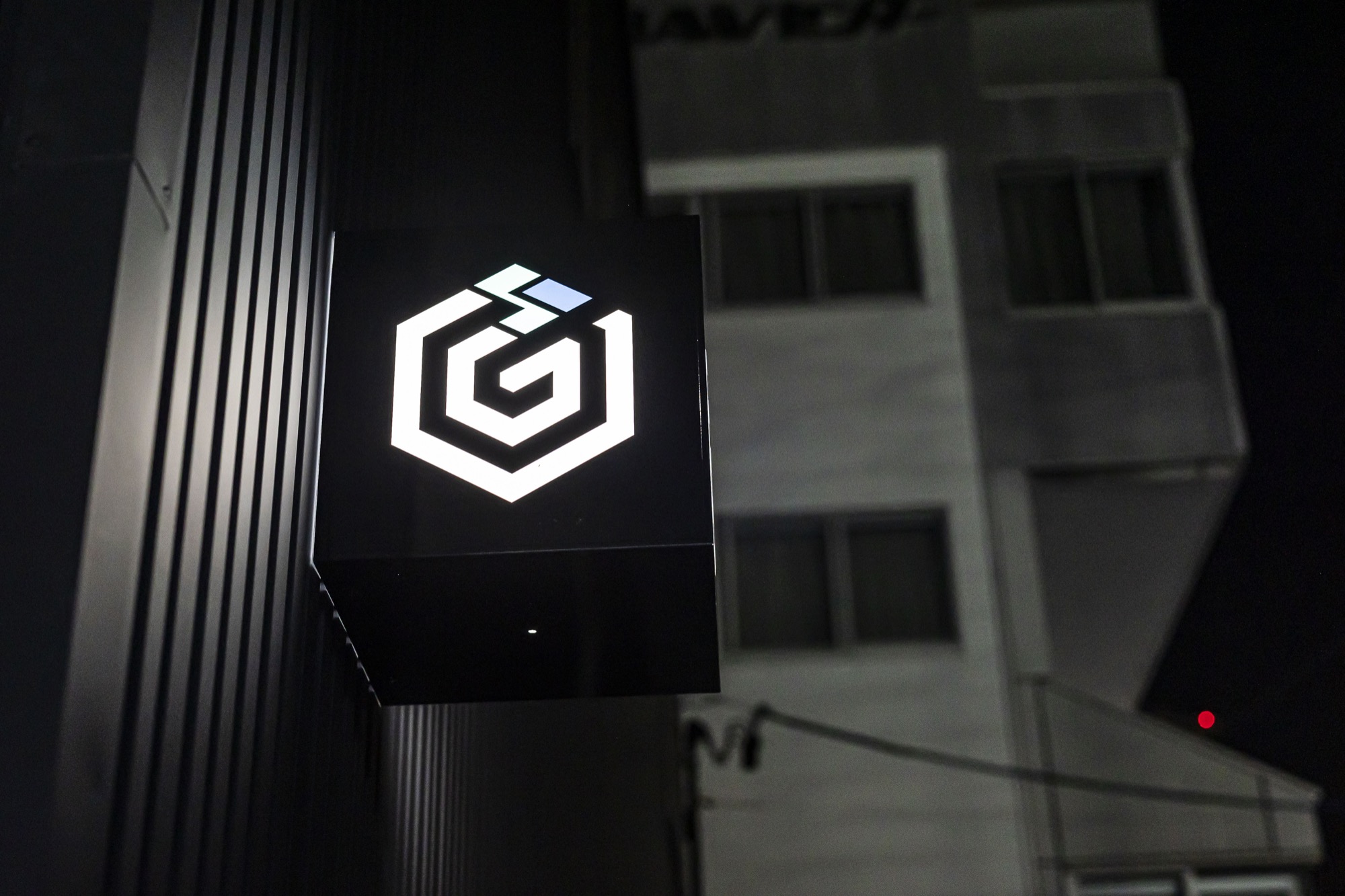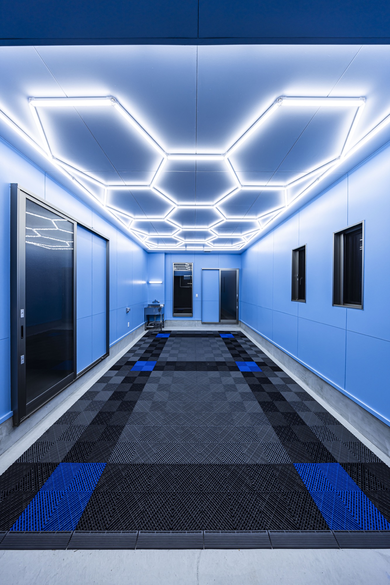 G’s東静岡 館名の「G’s」をモチーフにしたオブジェライトや、明かりで文字が浮かび上がる館銘板も印象的なアクセントに。 外灯のない道路沿いには、滑走路のライトを思わせるアッパーライトを配置し、建物を照らしつつ安全性にも配慮しました。