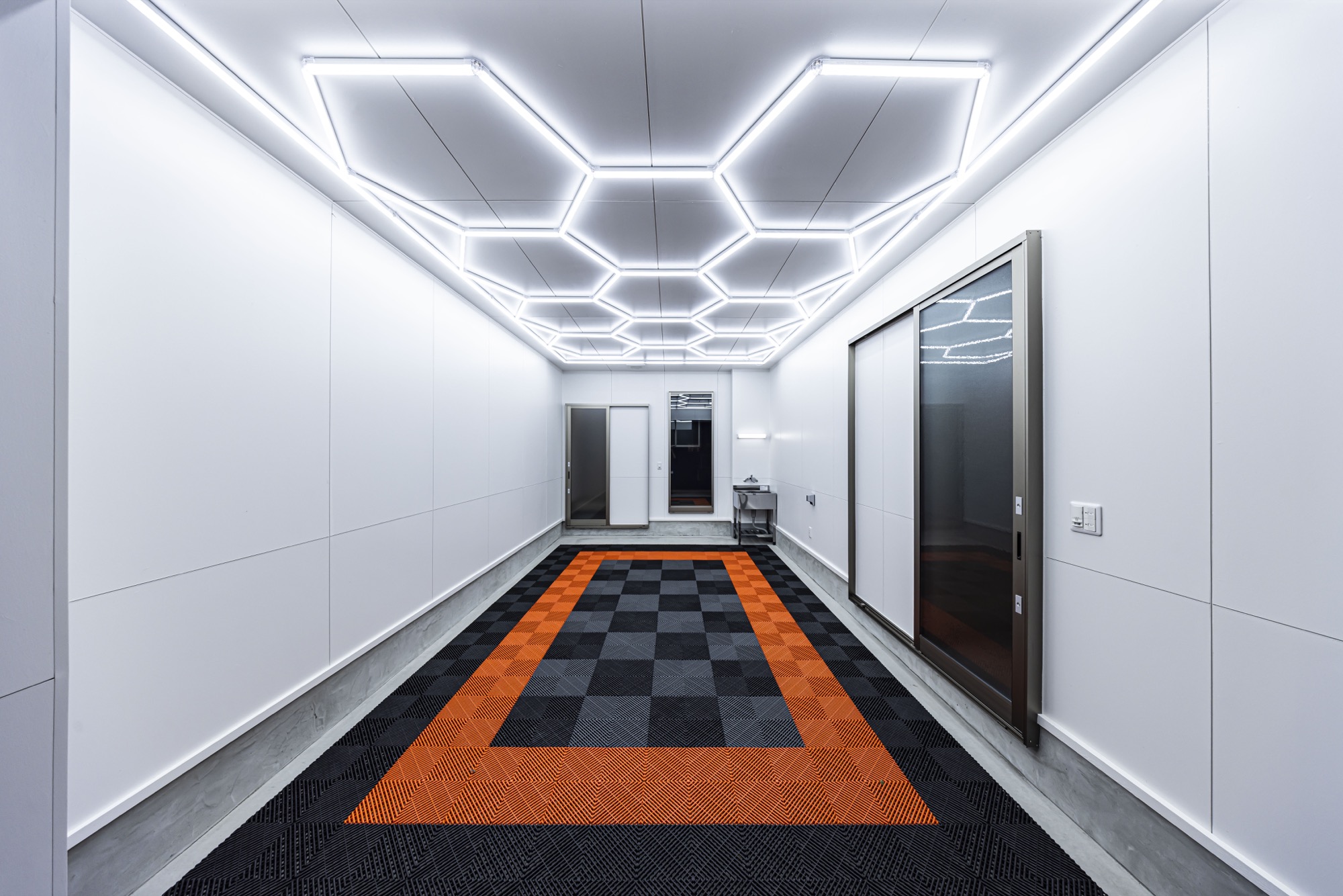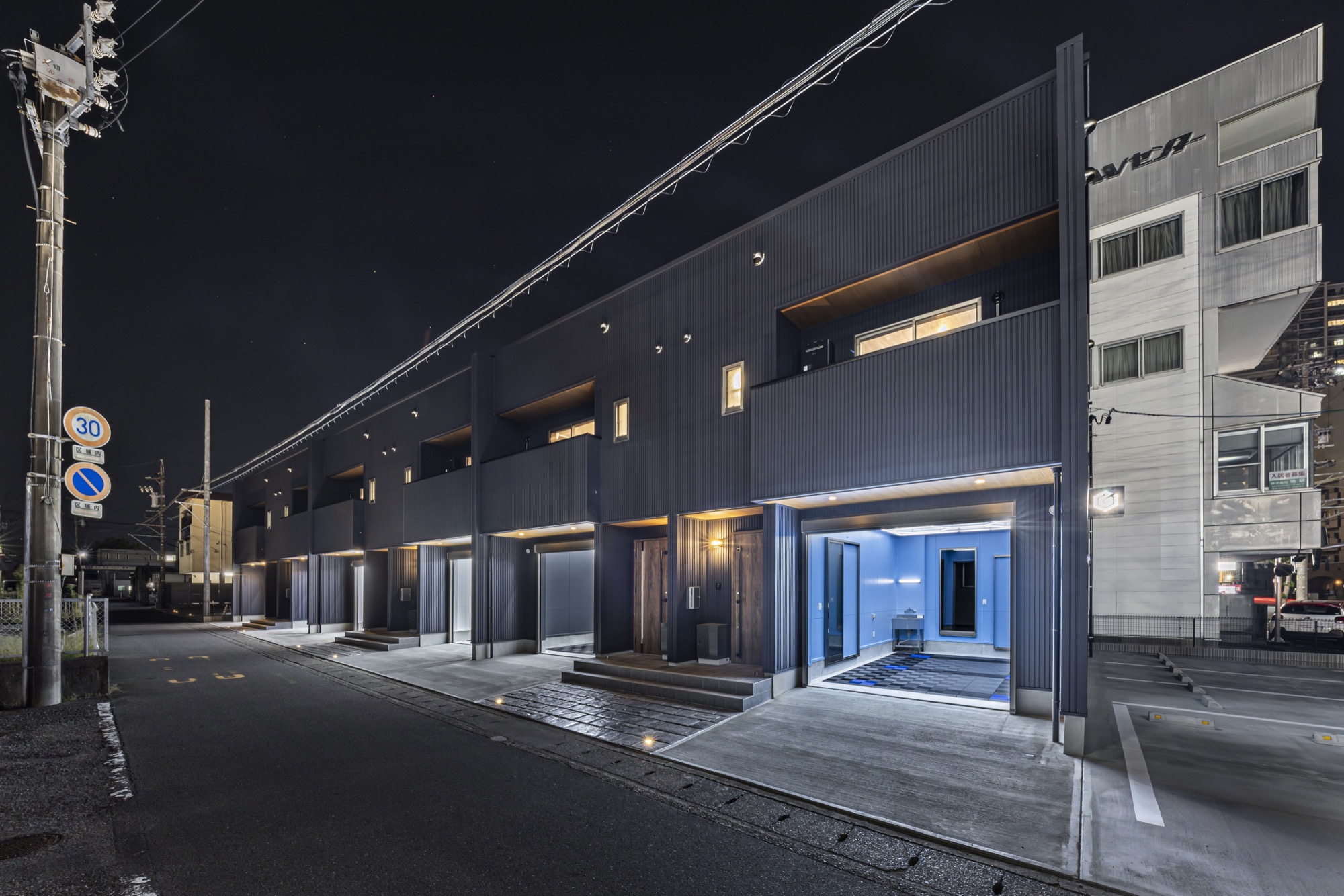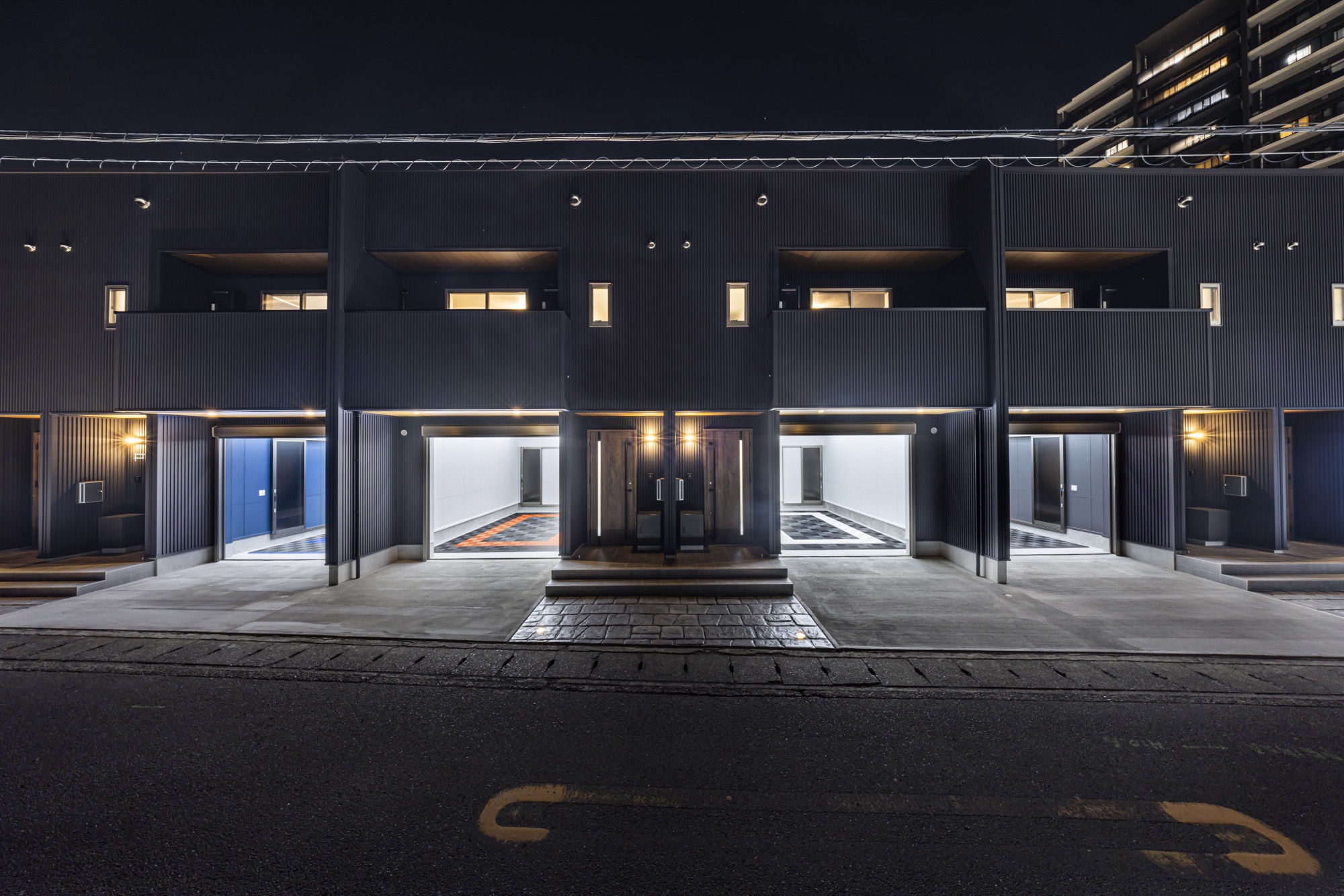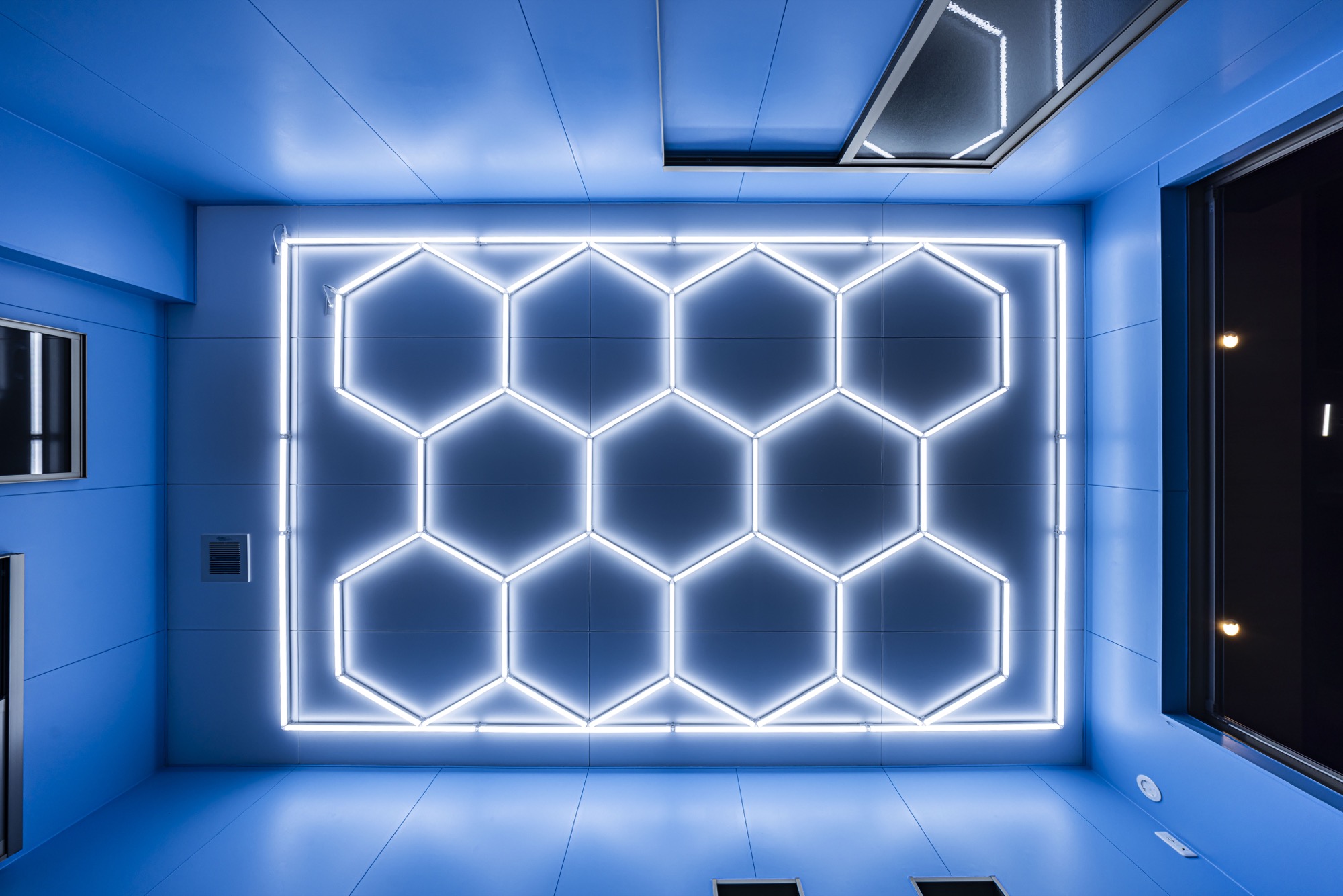 G’s東静岡 館名の「G’s」をモチーフにしたオブジェライトや、明かりで文字が浮かび上がる館銘板も印象的なアクセントに。 外灯のない道路沿いには、滑走路のライトを思わせるアッパーライトを配置し、建物を照らしつつ安全性にも配慮しました。